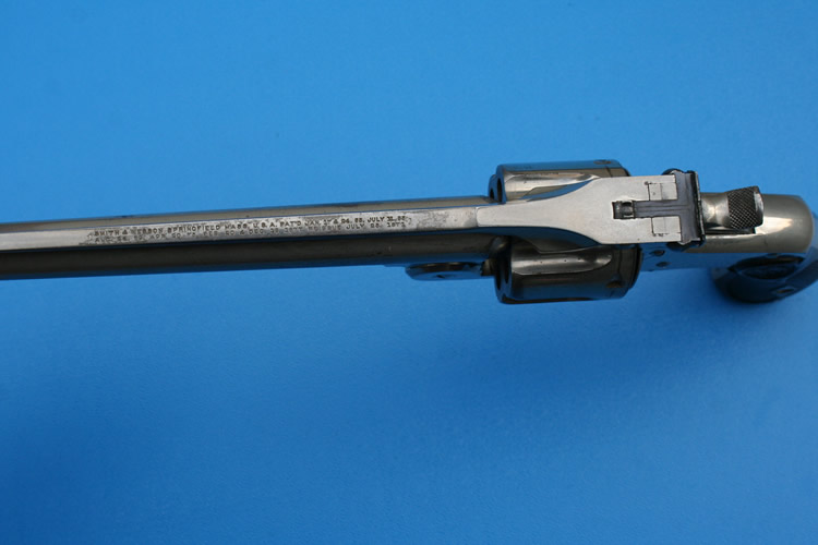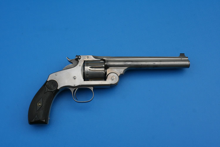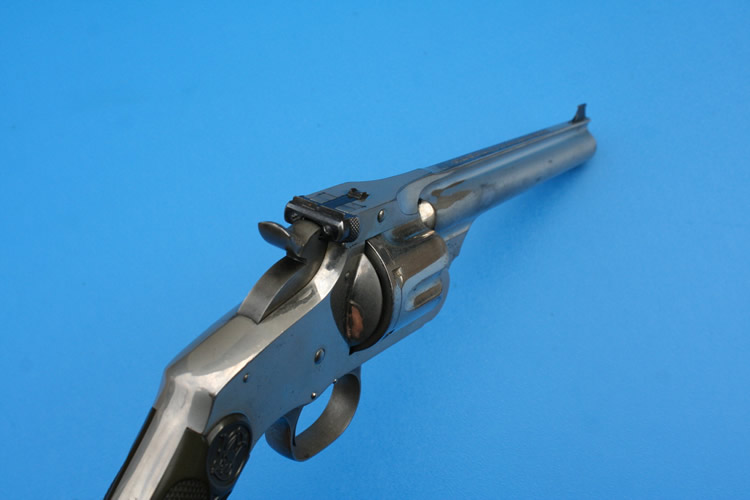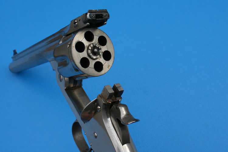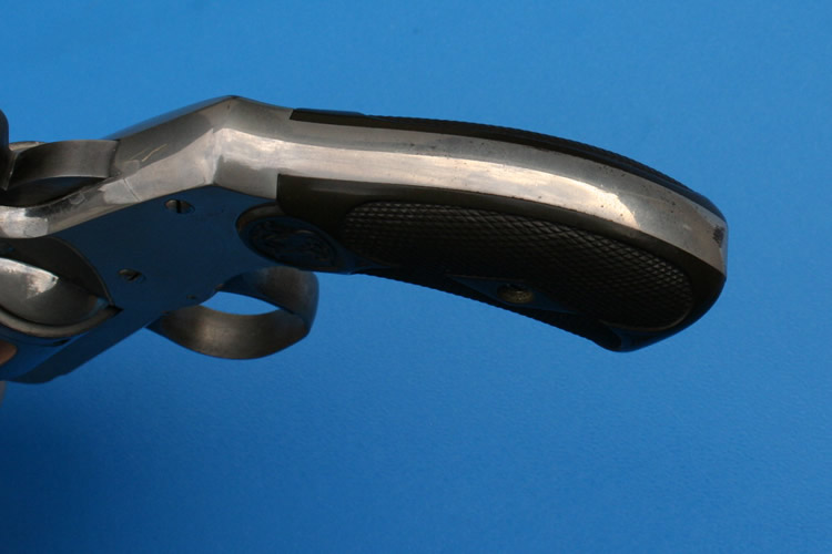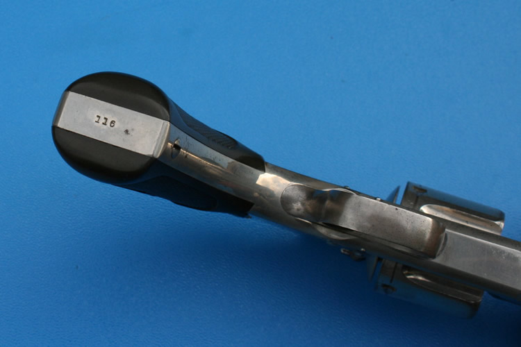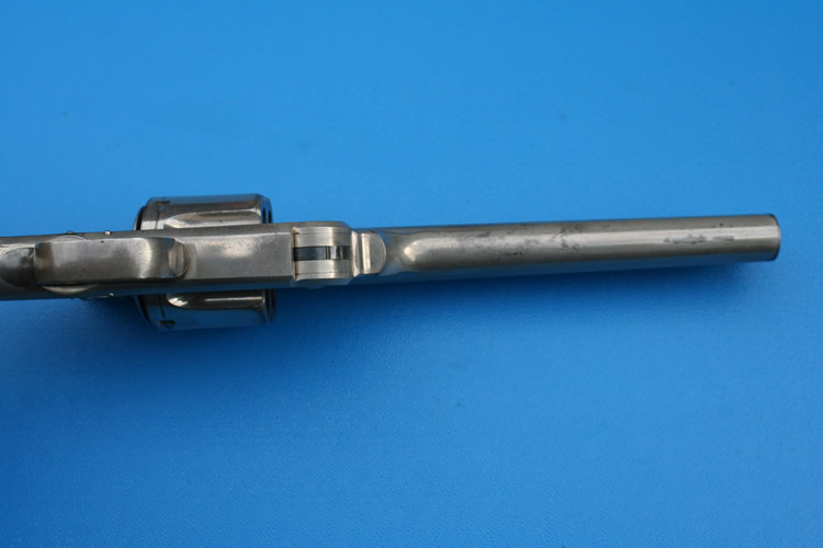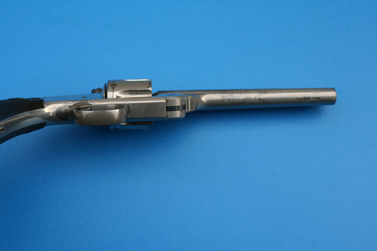 These revolvers were manufactured from 1887 to 1910. This excellent early example has the 6½ in barrel with adjustable sights and a very good bore. The revolver retains over 90% of its original nickel finish with good case harden finish on the hammer and trigger guard, the action and cylinder lock up are very good with excellent hard rubber grips.